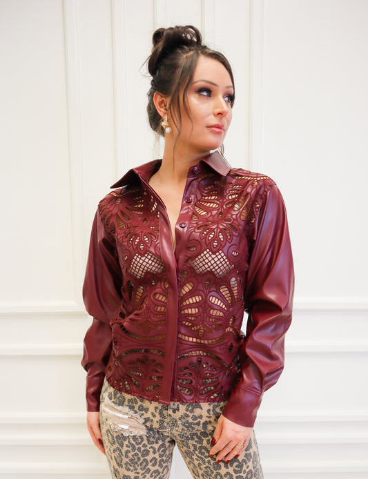 Crimson Cutout Faux Leather Button Up Top