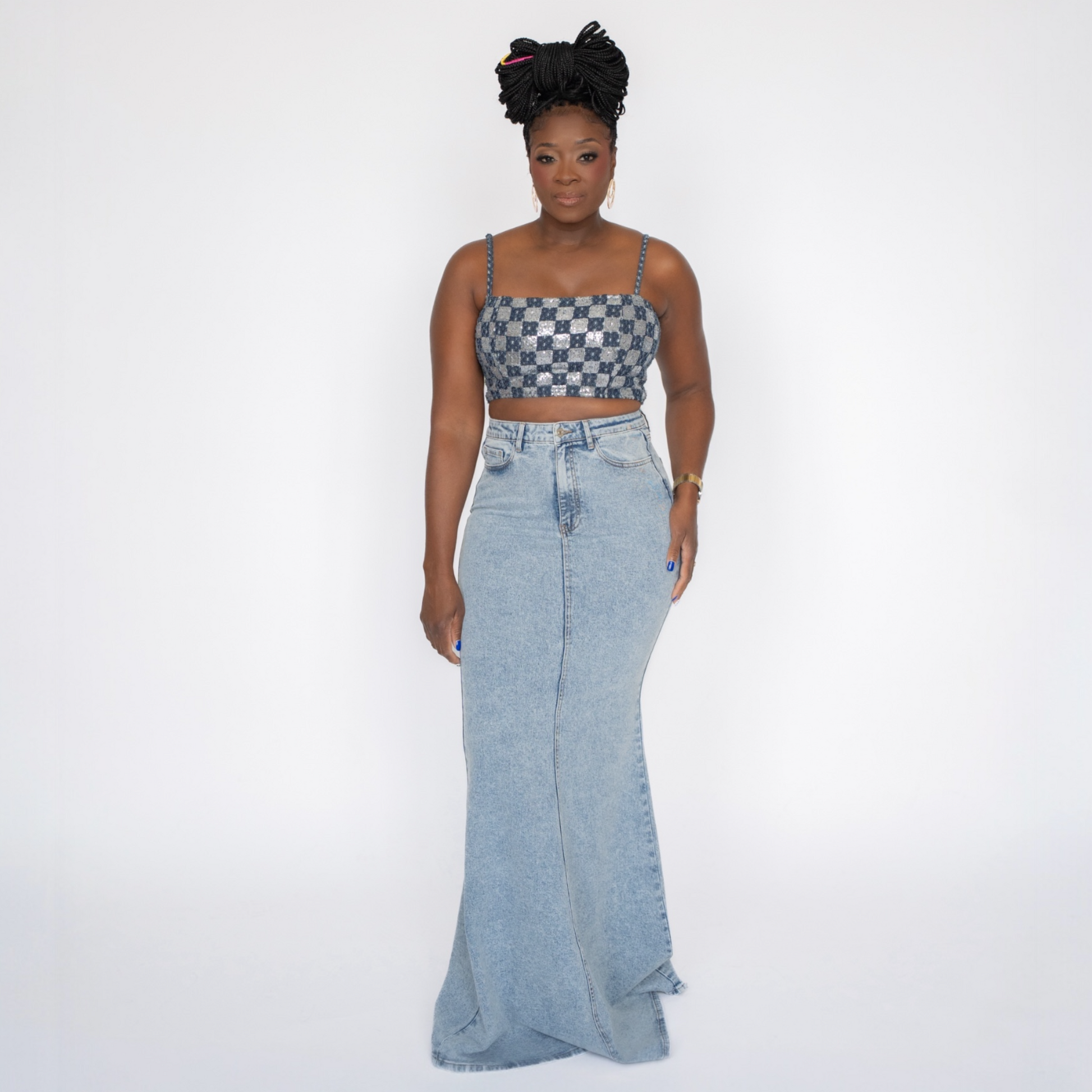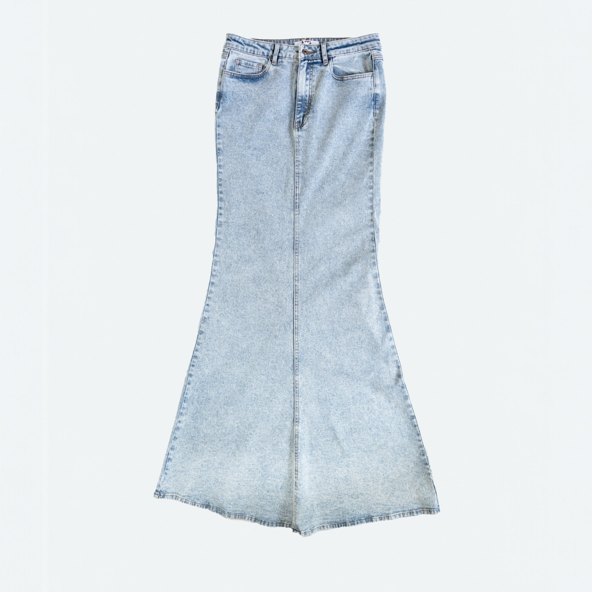 Classic denim gets a modern upgrade. The hourglass Denim Maxi Skirt features a sleek, body-hugging fit that flares subtly at the hem for that effortless hourglass silhouette. Designed with a high waist, center seam detailing, and a soft washed finish — it’s the perfect blend of structure and ease.