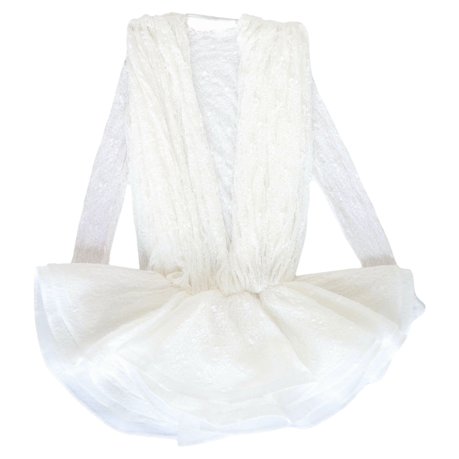 Where art meets allure — the Frosted Muse Dress is a statement piece designed for the woman who commands attention effortlessly. This sculptural mini features a sheer lace base layered with ethereal textured fabric that drapes like soft frost, creating movement and dimension with every step.